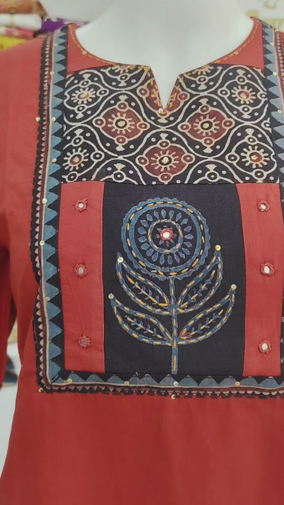 Add a touch of tradition to your everyday style with this beautifully designed rust red cotton short top. Featuring a striking handcrafted ethnic panel on both front and back, this piece blends comfort with artistic elegance. The intricate thread work, subtle mirror accents, and geometric borders enhance its unique appeal.